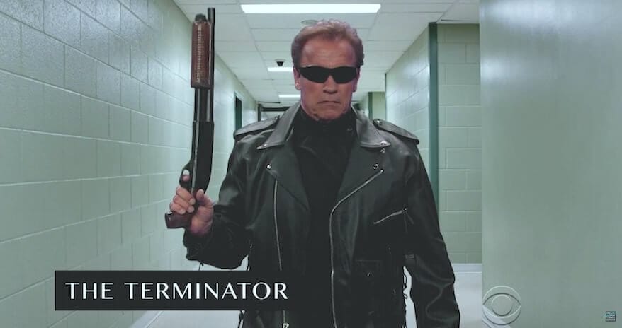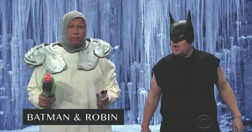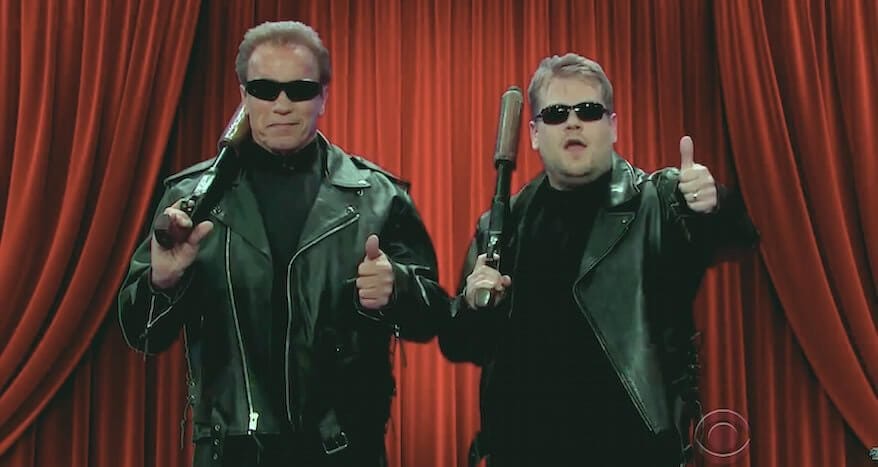 Depois do sucesso com a reencenação de filmes com o Tom Hanks, James Corden está de volta – desta vez com Arnold Schwarzenegger.