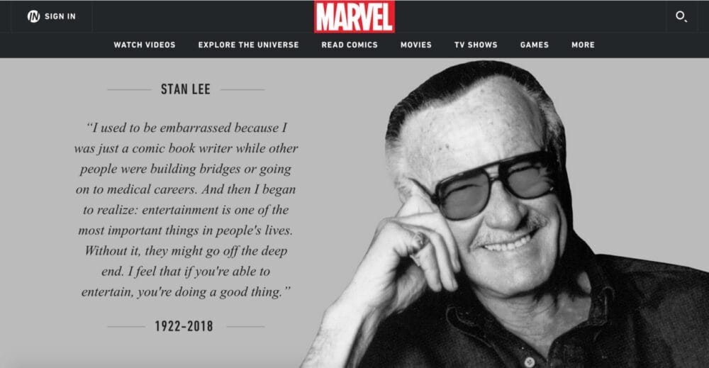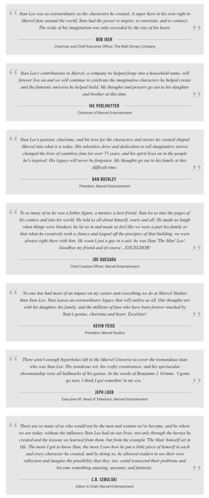 Uma perda enorme para todos, mas certamente ainda maior para os os familiares, amigos e colegas mais próximos. O site da Marvel amanheceu com uma pequena biografia de Stan Lee e com algumas declarações mais oficiais do board da Marvel/Disney como Bob Iger (Chairman and Chief Executive Officer, The Walt Disney Company) e Ike Perlmutter (Chairman of Marvel Entertainment), entre outros.