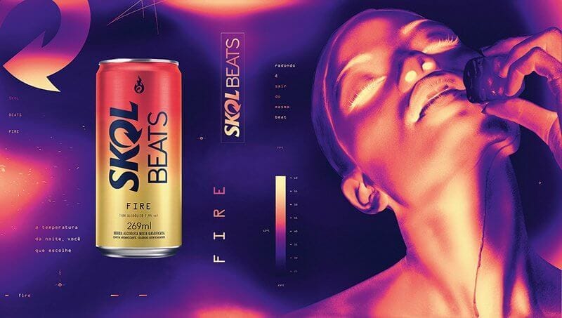 SKOL Beats Fire & Frost: duas novas bebidas – dois novos sabores e duas novas sensações (calor e de refrescância) – em edição limitada (alguém ainda coleciona latinhas de cerveja?) e em embalagens especiais, a versão Fire em tons em laranja, amarelo e vermelho, e a Frost uma mistura entre o roxo e o azul.