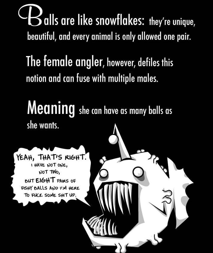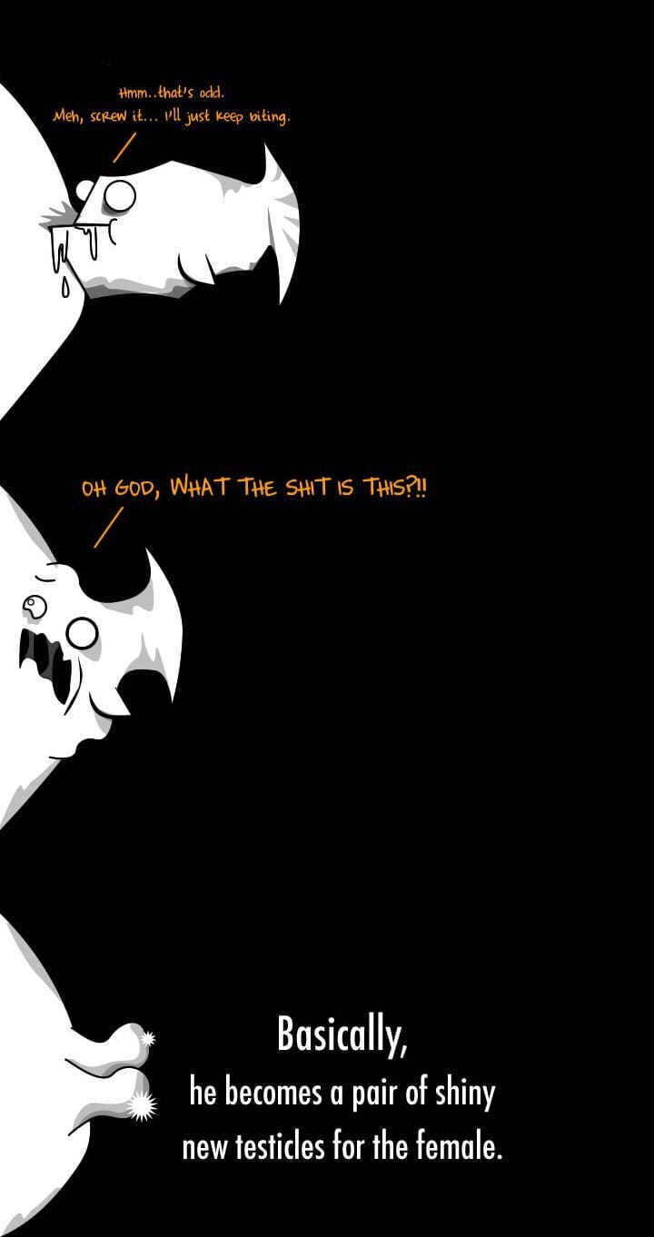 Ficam vagando no fundo do oceano só atrás dela. Quando finalmente conseguem localizar alguma, começam a dar umas mordidinhas de reconhecimento e suas bocas acabam grudando no corpo da fêmea, que nem língua em sorvete gelado. A boca do macho começa então a “derreter” e logo depois todos os orgãos internos também derretem.