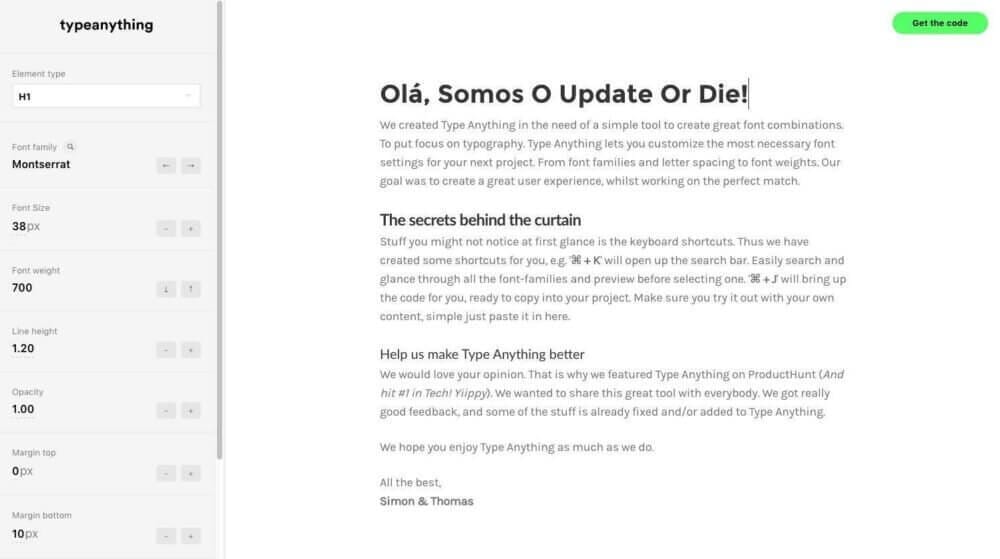 O Type Anything é uma ferramenta online bastante simples que ajuda nesse processo disponibilizando um cardápio de opções de fontes, tamanhos, espaçamentos, opacidade, margens e todo tipo de transformações. E quando você estiver satisfeit@, é só clicar em “get the code” e copiar lá no seu CSS customizado.