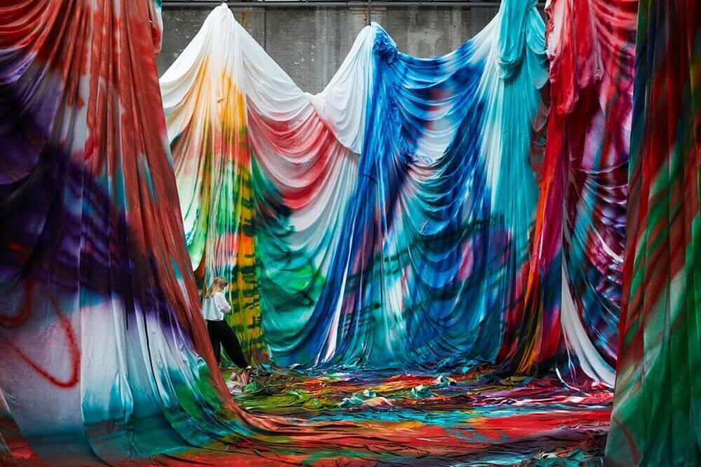 “The Horse Trotted Another Couple of Meters, Then It Stopped” é uma instalação criada pela artista alemã Katharina Grosse que transformou o interior de um armazém em um labirinto colorido. A artista usou tecidos e uma pistola de pulverização para pintá-los, transformando a arquitetura do edifício histórico em uma massa densa de cores vivas.