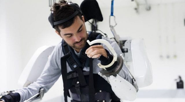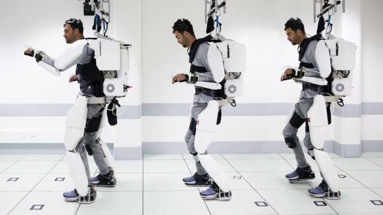 Homem paralisado caminha usando traje robótico controlado pelo cérebro.
