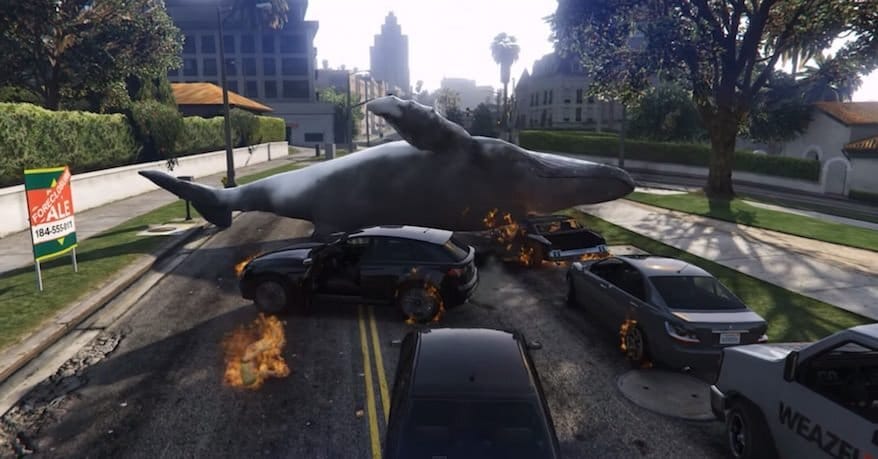 Foi isso que fez o usuário Merfish, que subiu um video no YouTube para nos mostrar sua ideia: uma baleia, arremessada pelas ruas da cidade de Los Santos (Grand Theft Auto V )… só para ver o que acontece.