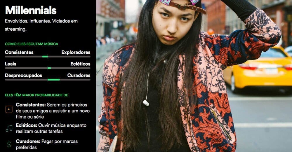 O Spotify analisou a maneira como mais de 140 milhões de pessoas escutam música e identificou hábitos exclusivos relacionados ao streaming. Os usuários são de diferentes lugares do mundo e a pesquisa quis descobrir como seus hábitos de streaming se relacionam com sua vida offline. O que isso significa? Seus traços de personalidade e suas opiniões sobre marcas até seus comportamentos de compra.