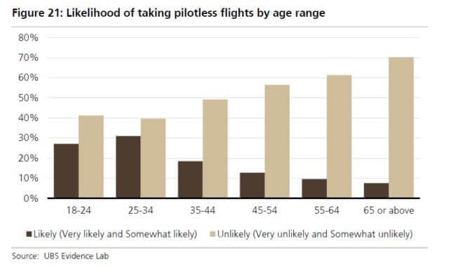 Uma pesquisa levantada pela empresa de serviços financeiros UBS – Union de Banques Suisses e da Société de Banque Suisse sugere que passageiros desconfiam de aviões sem piloto, mesmo que as tarifas fiquem mais baixas. A pesquisa ainda revela que mais da metade das pessoas entrevistadas se recusaria a viajar em uma aeronave totalmente automatizada, precisamente 54% dos 8 mil entrevistados. O grupo com mais de 45 anos foi o mais resistente a ideia. O grupo entre 25 e 34 anos de idade, correspondente a 17% dos entrevistados, disseram que embarcariam em um avião sem piloto.