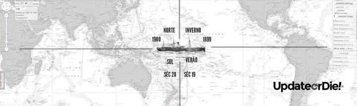 “Hoje, exatamente a meia-noite, seremos os únicos humanos a estar AO MESMO TEMPO em dois hemisférios, dois dias, dois meses, dois anos, duas estações e dois séculos. Ao caminhar de proa à popa, de bombordo a estibordo, poderemos experimentar passar entre inverno e verão, entre o norte e o sul e entre o século 19 e o século 20”